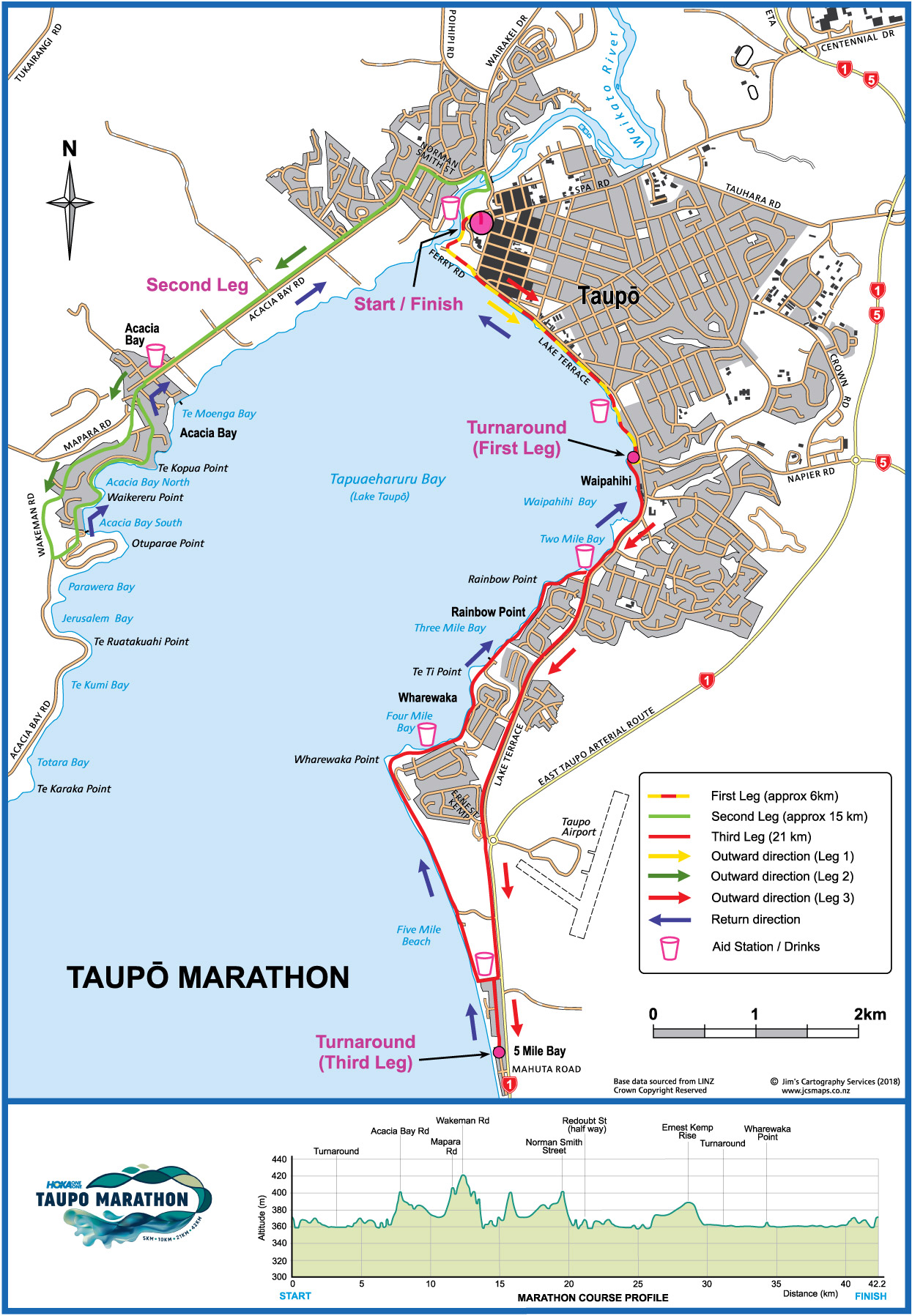 This is an example of an Event map. It is the 2018 Taupō Marathon Course. It shows the route and profile. Note: The course has been changed and the town has grown since this version was created.